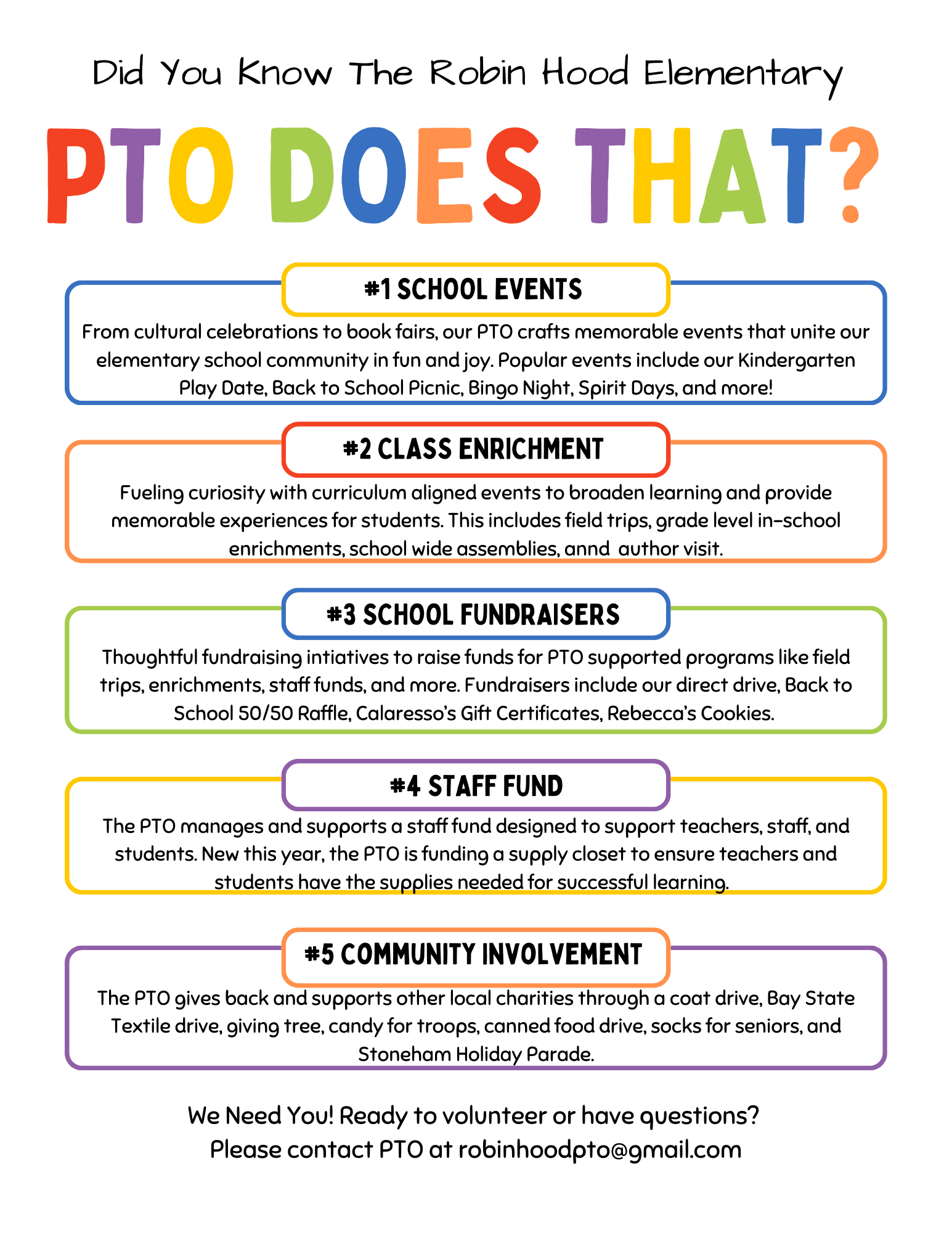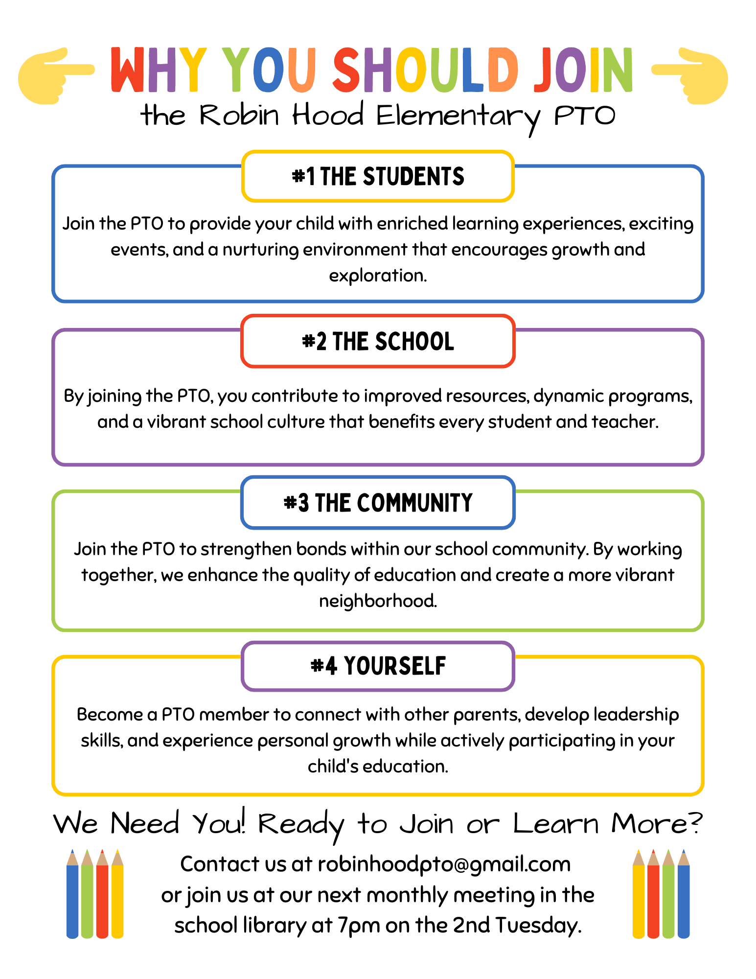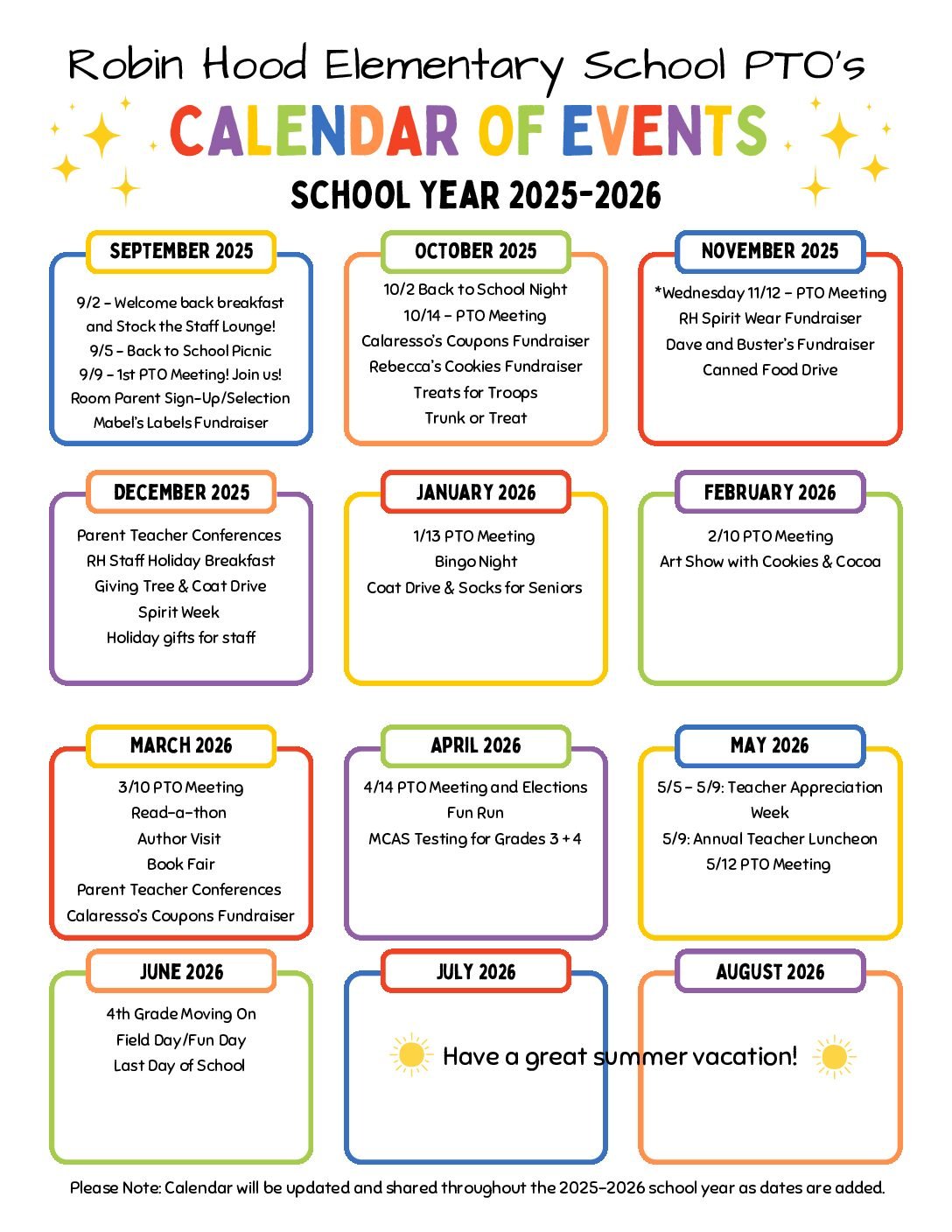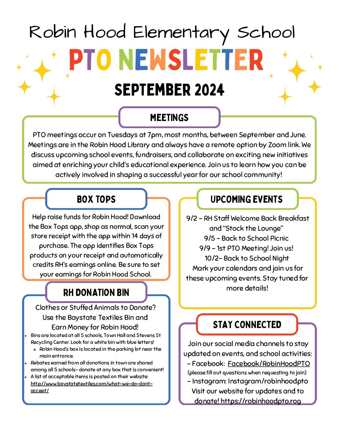 Welcome back families and students! We hope everyone enjoyed their summer. The Robin Hood PTO is looking forward to the 2025-2026 school year and the upcoming opportunities to come together as a community. Please see the attached welcome packet to learn more about the PTO and fliers with details on upcoming events. Please return all forms by September 12th.